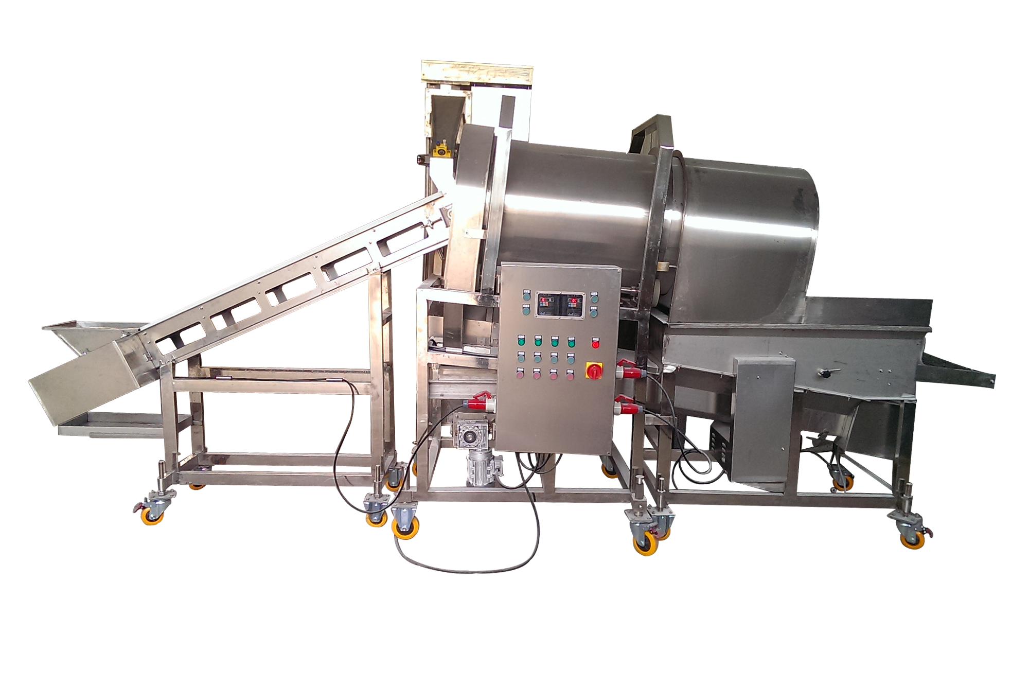 原料經(jīng)過提升機(jī)輸送機(jī)提升至滾筒內(nèi);滾筒滾動(dòng)時(shí)原料與粉料充分混合,粉料被均勻地包裹在原料表面上;多余粉料經(jīng)過滾筒后端時(shí)通過滾筒篩網(wǎng)孔漏掉,而產(chǎn)品落在輸出網(wǎng)帶機(jī)上;網(wǎng)帶機(jī)設(shè)有附粉振動(dòng)機(jī)構(gòu),可以將產(chǎn)品表面多余的附粉振落,最后將產(chǎn)品輸送到下一工序。可以同上漿機(jī)、上面包屑機(jī)連接,組成不同產(chǎn)品的生產(chǎn)線。從而完成粉、漿、粉,漿、粉及漿、粉、粉工藝。