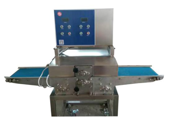 【 .輸送帶為寶石紋,厚度3mm,輸送帶與刀口幾乎貼合,肉片不會卷到輸送帶內。