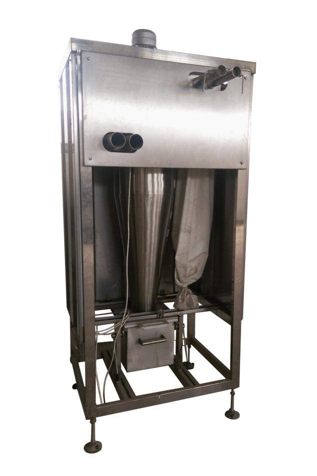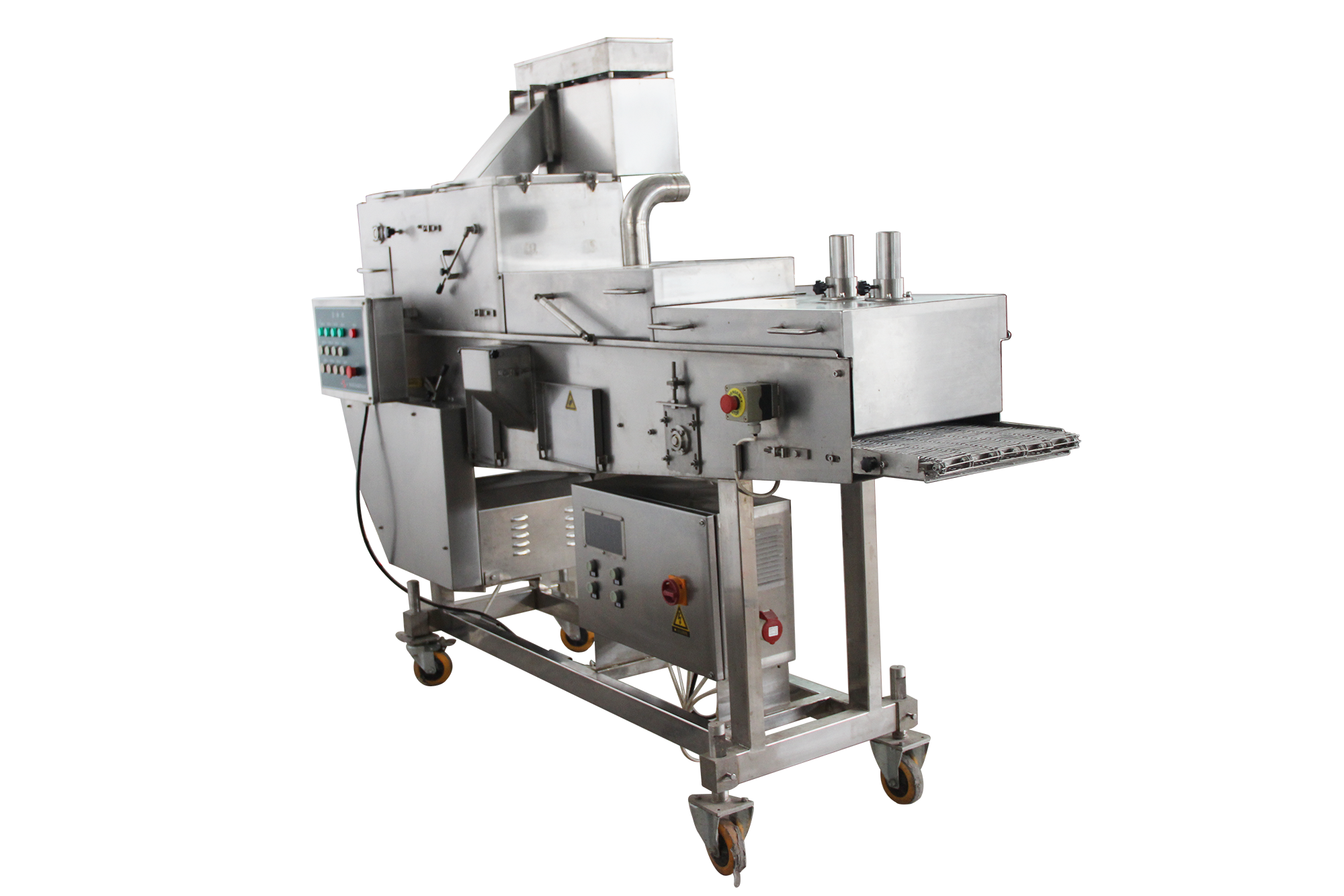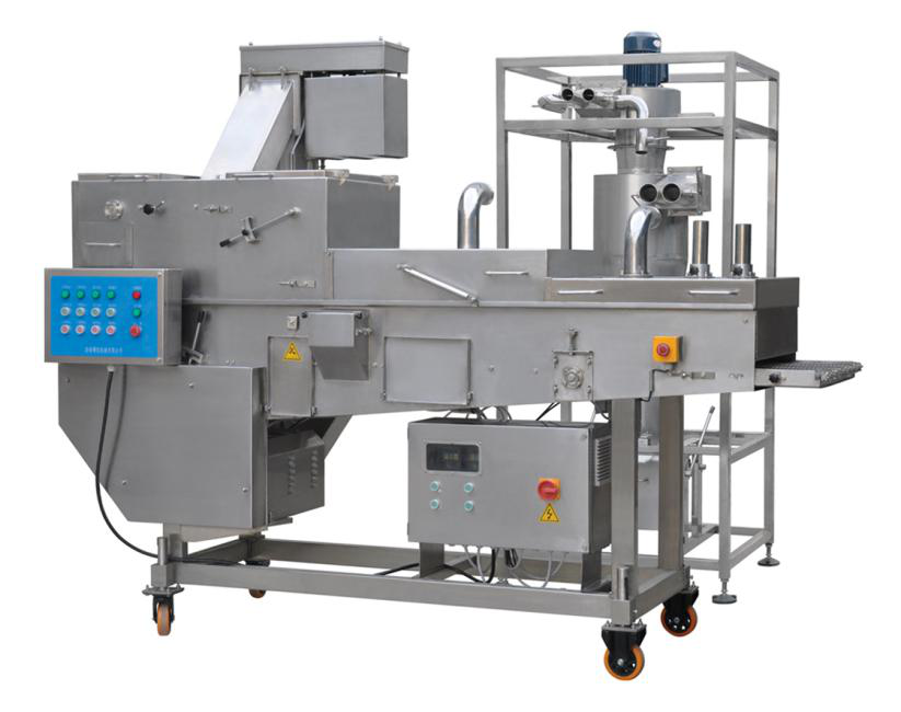 裹粉機(jī)能自動完成產(chǎn)品的上粉過程,適用于各種預(yù)上粉、混合粉等。產(chǎn)品進(jìn)入下網(wǎng)帶,底部及側(cè)面沾滿粉,從上料斗流下的粉將產(chǎn)品上部覆蓋,經(jīng)壓輥壓緊(上下網(wǎng)帶上的粉厚度可以方便調(diào)節(jié)),上粉后經(jīng)過風(fēng)管,將多余的粉吹落。進(jìn)入下一道程序。產(chǎn)品通過傳送網(wǎng)帶時被均勻的裹涂上一層混合粉,以適應(yīng)下道工序的要求,可以同上漿機(jī)、上面包屑機(jī)連接,組成不同產(chǎn)品的生產(chǎn)線。從而完成粉、漿、粉,漿、粉及漿、粉、粉工藝。