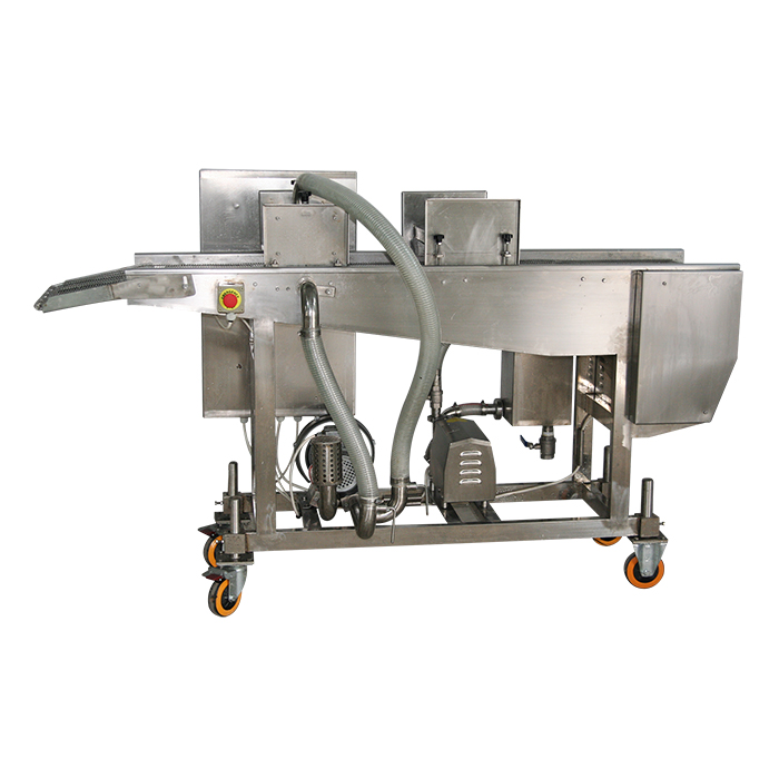 上稀漿機(jī)是通過(guò)漿幕和下部的承漿板把漿液均勻粘附在產(chǎn)品上,通過(guò)風(fēng)刀時(shí),多余的漿液被吹掉。然后輸入到下一工序。淋漿機(jī)適用于上面包屑和上粉前的工藝。雞塊掛漿機(jī)適合于雞肉、牛肉、豬肉、魚(yú)、蝦等海鮮產(chǎn)品,雞塊裹漿機(jī)可以對(duì)市場(chǎng)上流行的雞腿,雞排,魚(yú)排,漢堡肉餅、麥樂(lè)雞塊、魚(yú)香漢堡肉餅、土豆餅、南瓜餅、肉串等產(chǎn)品進(jìn)行上漿處理,是食品工廠(chǎng)理想的上漿設(shè)備。
