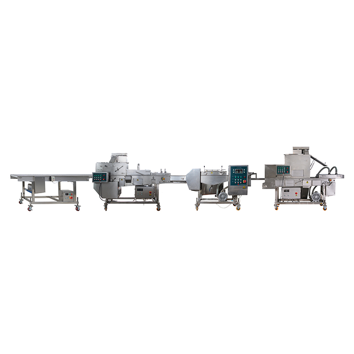 魷魚圈生產(chǎn)線把蝦或者其他海產(chǎn)品經(jīng)上粉,上稠漿,上鮮康或者干康,油炸,速凍等工藝做出裹粉的炸雞腿。面包蝦生產(chǎn)線的需要配置前處理設(shè)備和后處理設(shè)備:油炸,包裝等設(shè)備,